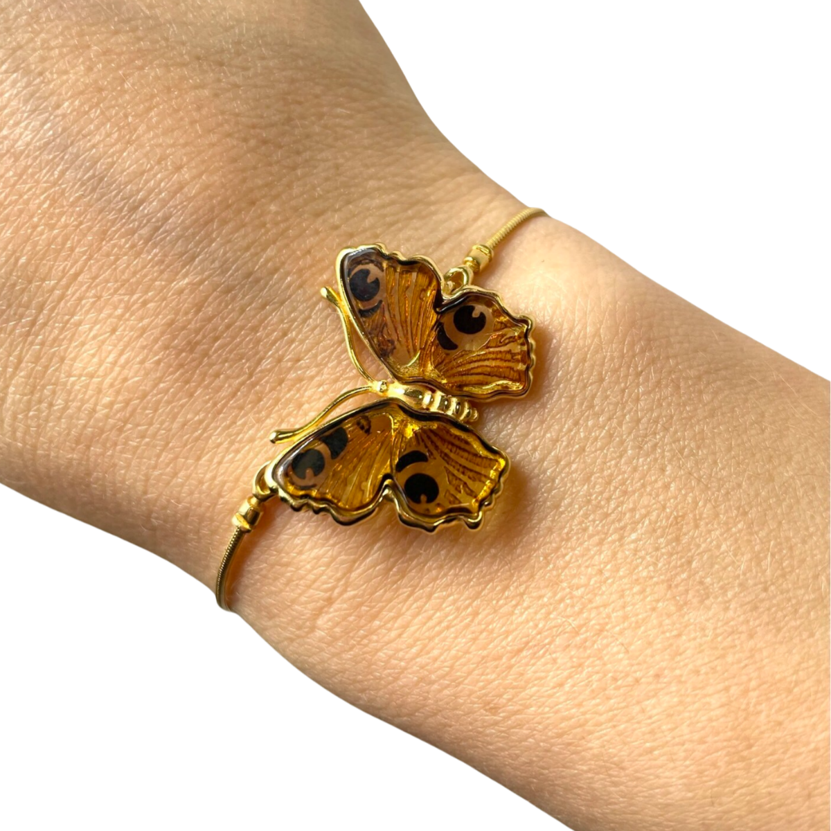 Add a touch of elegance to your jewelry collection with this beautiful gold-plated amber butterfly bracelet. The bracelet features genuine amber stones that are hand-selected for their unique color and characteristics, and shaped into the delicate design of a butterfly. The gold plating enhances the natural beauty of the amber and adds a touch of luxury to the design. The bracelet is adjustable, making it a versatile piece that can be worn by women of all wrist sizes. Whether you're looking for a special gift for someone special or simply want to treat yourself, this gold-plated amber butterfly bracelet is the perfect choice.