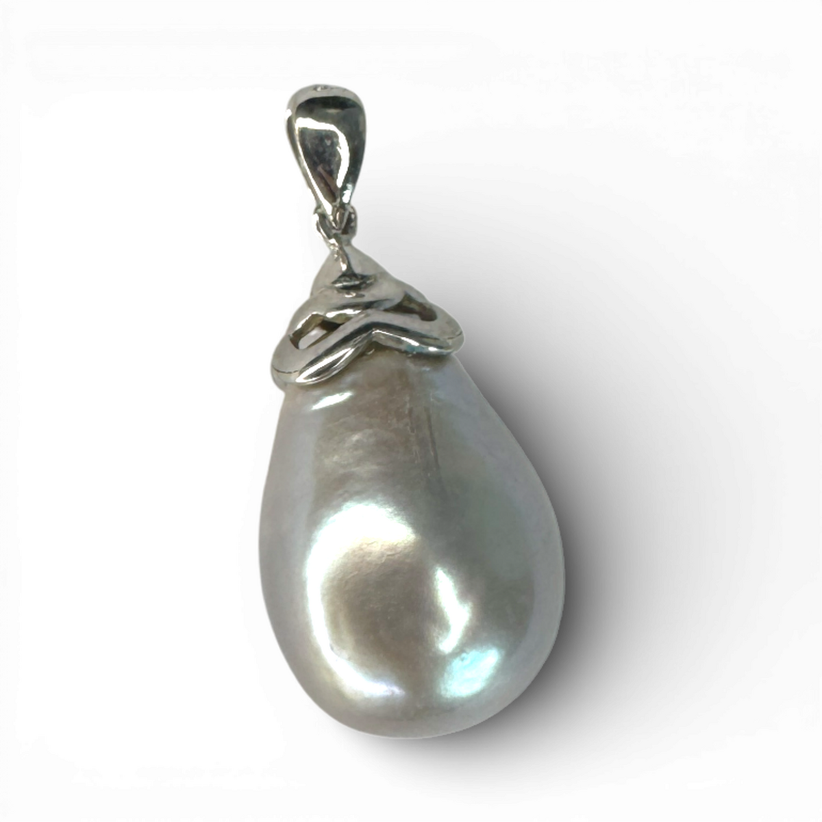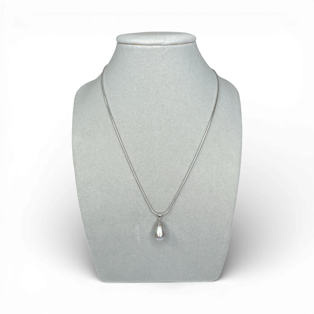 A minimalist pendant crafted from sterling silver and finished with a grey pearl. The cool tone and understated design create a modern, elegant statement. Versatile and effortlessly stylish.