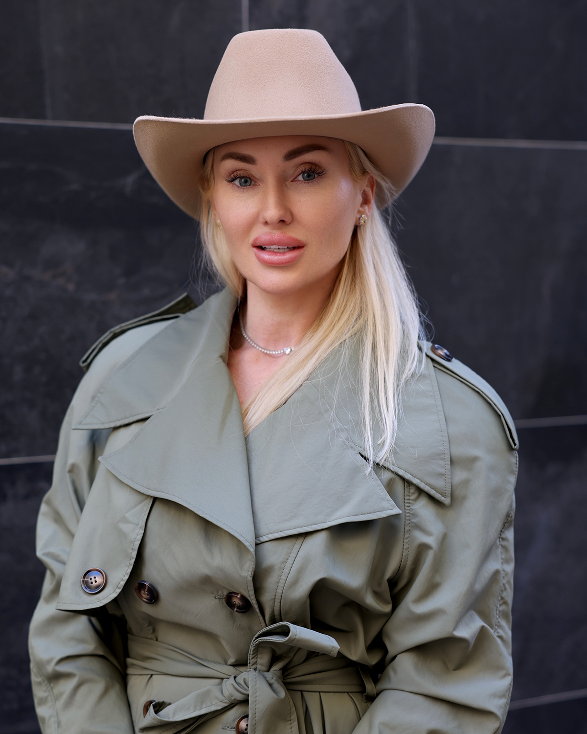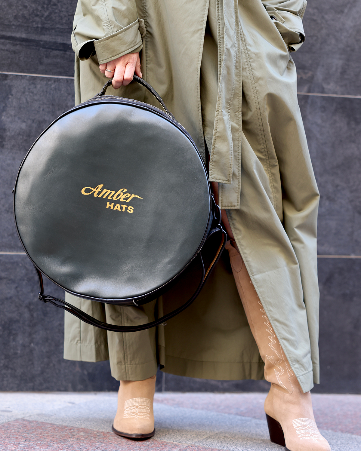 A sophisticated, ready-to-wear look that blends timeless tailoring with modern Western accents. The structured grey trench coat creates an elegant silhouette, complemented by taupe suede cowboy boots and a refined felt hat for a confident, fashion-forward finish. Silver jewelry with zircon details adds a touch of light and femininity, while the premium hat travel bag from AmberHats ensures both protection and style on the go.