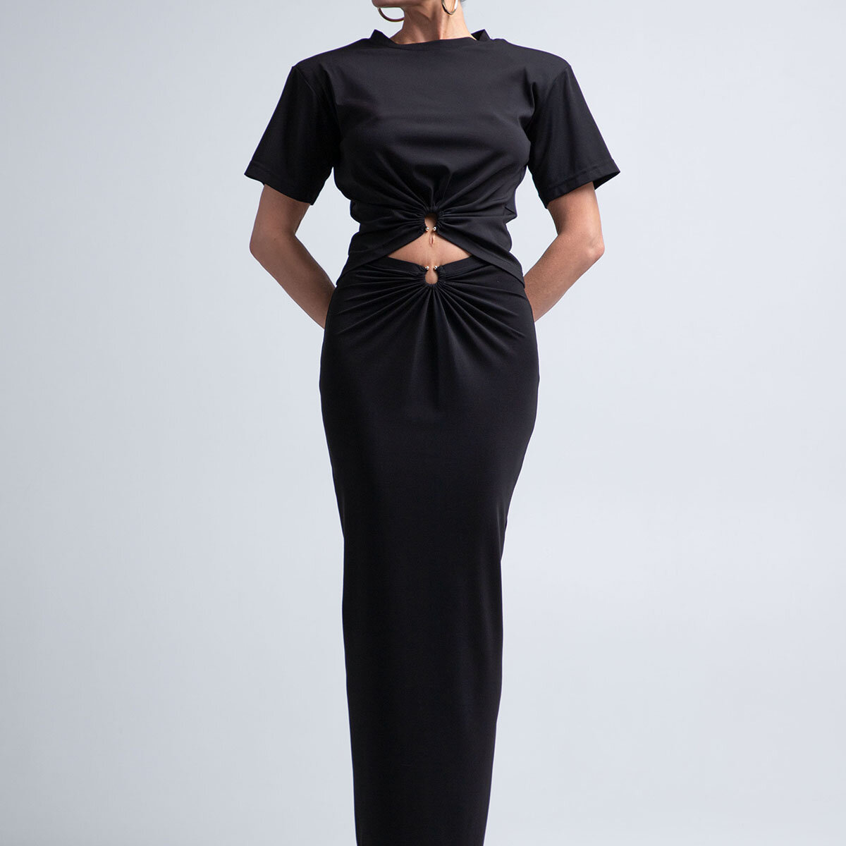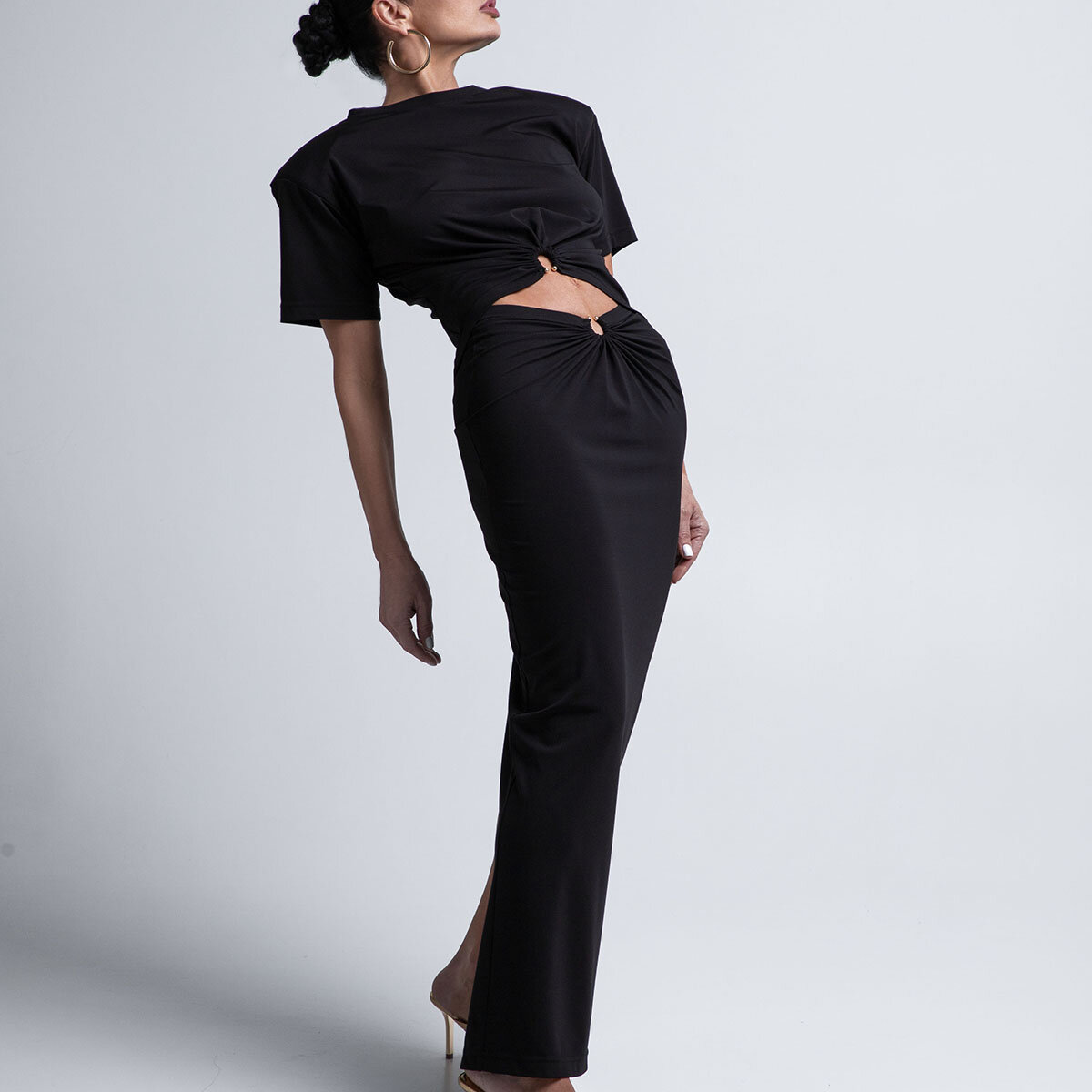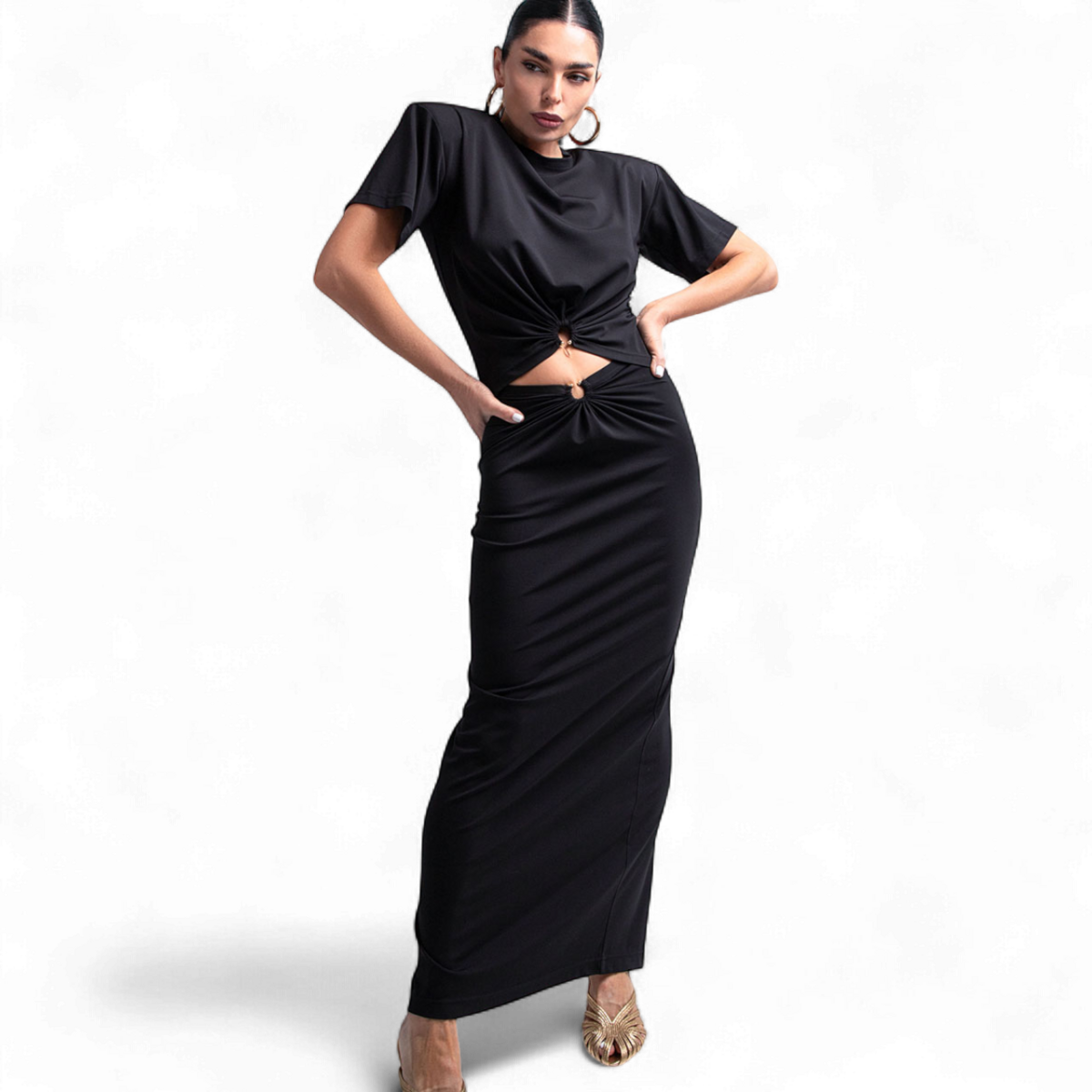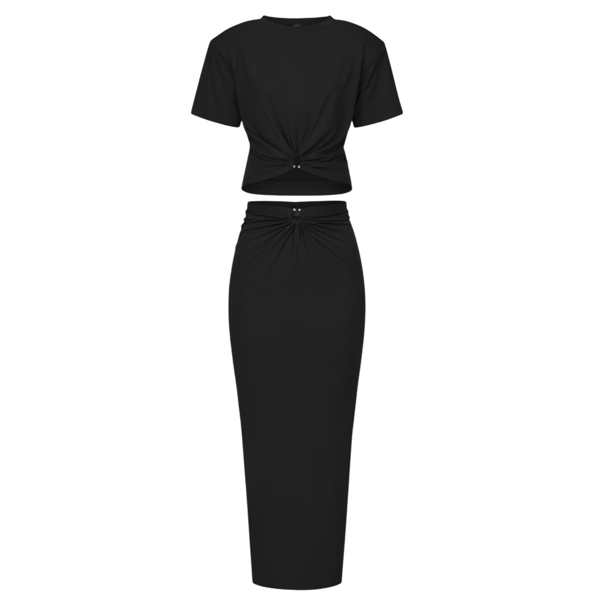 Стильний та сучасний вигляд, цей мінімалістичний комплект з двох частин включає вузловий кроп-топ та спідницю міді з високою талією. Розроблений для комфорту та легкого стилю, він ідеально підходить як для повсякденних, так і для більш вишуканих випадків.