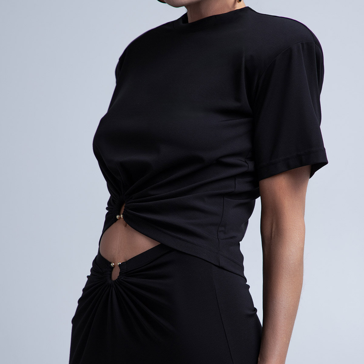 Топ: короткі рукави, вузловий елемент спереду, укорочена довжина