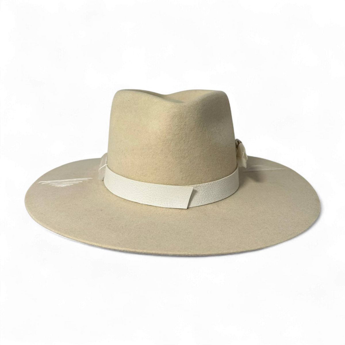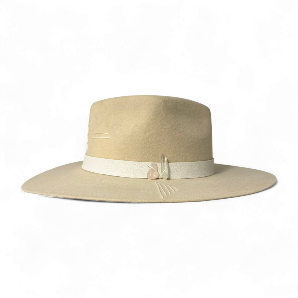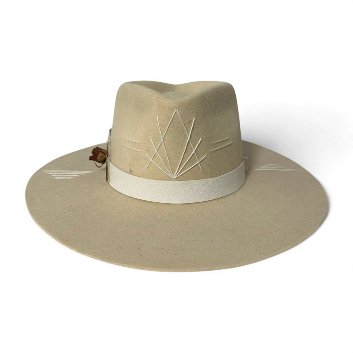 Елегантний капелюх з тонкої слонової вовни, продумано оздоблений рустикальною кремовою шкіряною стрічкою та прикрашений кристалом селеніту і рожевим кварцом для додавання природної енергії. Етнічна ручна вишивка та висушена натуральна троянда завершують цей унікальний, майстерний дизайн.