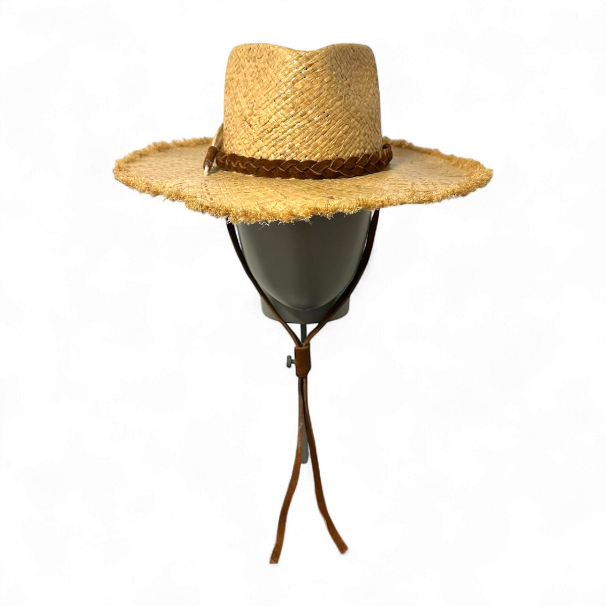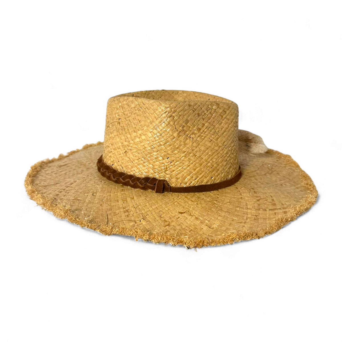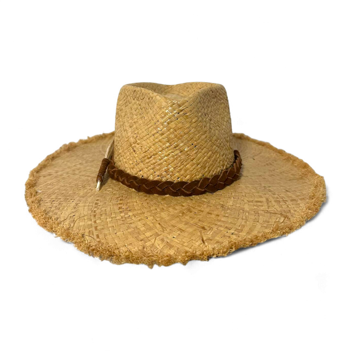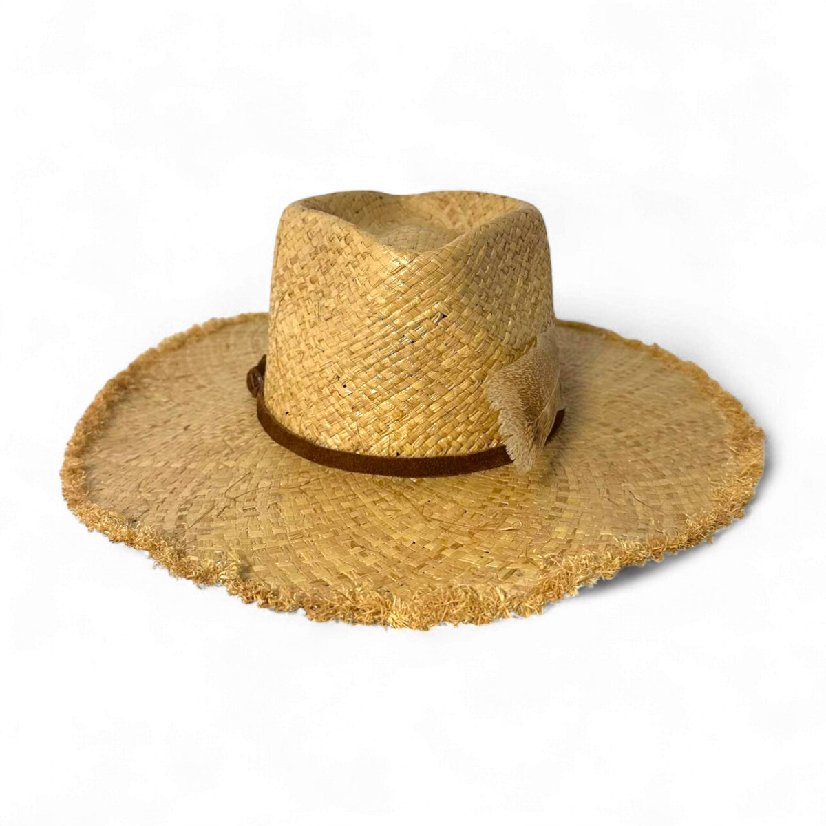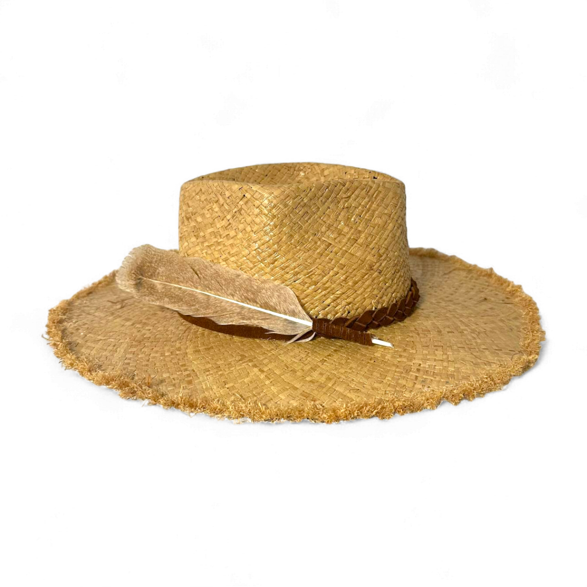 Богемний капелюх з рафії з необробленими бахромчастими краями для розслабленого, невимушеного вигляду. Він оснащений плетеним замшевим ремінцем тютюнового кольору з підвішеними замшевими стрічками, красиво прикрашеними пір’ям дикого індика.