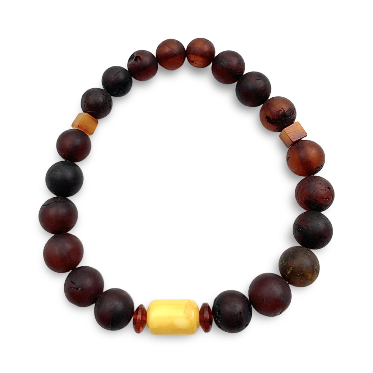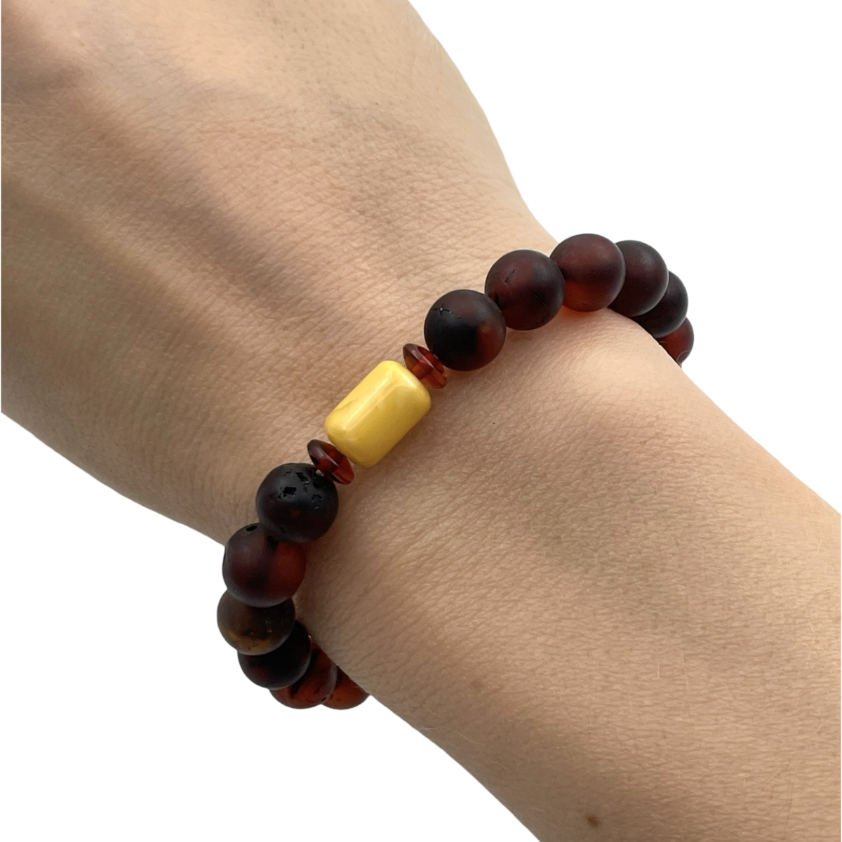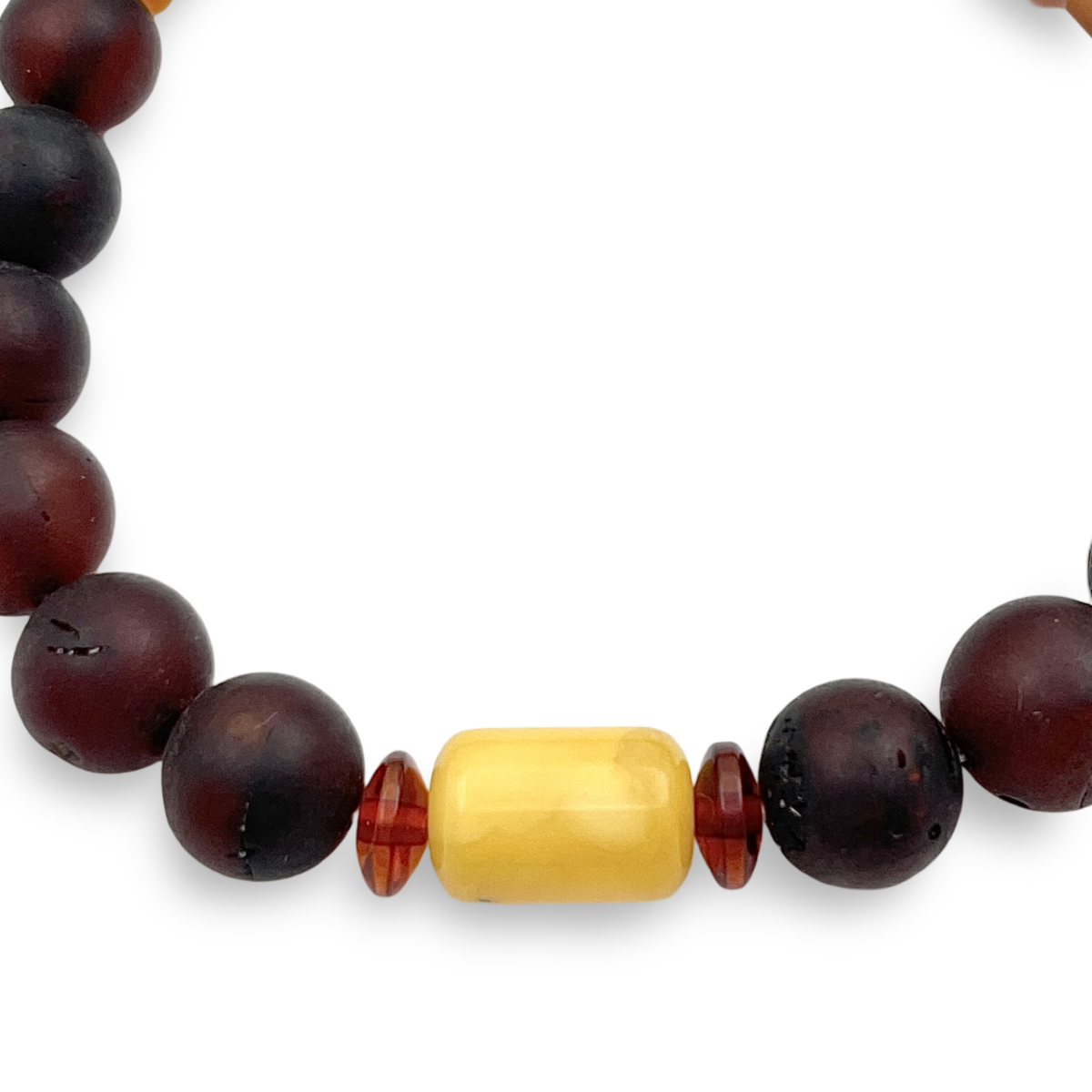 Представляємо браслет з бурштину, вражаючий виріб, який підкреслює глибокі, насичені відтінки темно-червоного бурштину. Кожна бурштинова намистина ретельно відполірована, щоб підкреслити її природне тепло та сяйво, створюючи браслет, який одночасно сміливий і елегантний. Розроблений з еластичною стрічкою для комфортної посадки, цей браслет ідеально підходить для щоденного носіння або особливих випадків. Його вічна привабливість робить його ідеальним аксесуаром для тих, хто цінує красу натуральних матеріалів, або як продуманий подарунок для близьких.