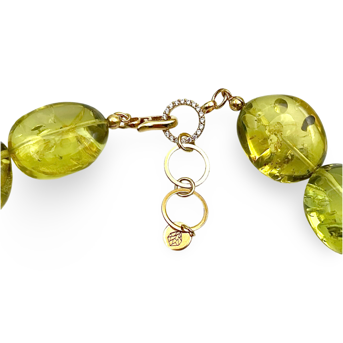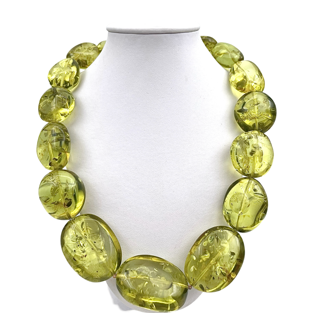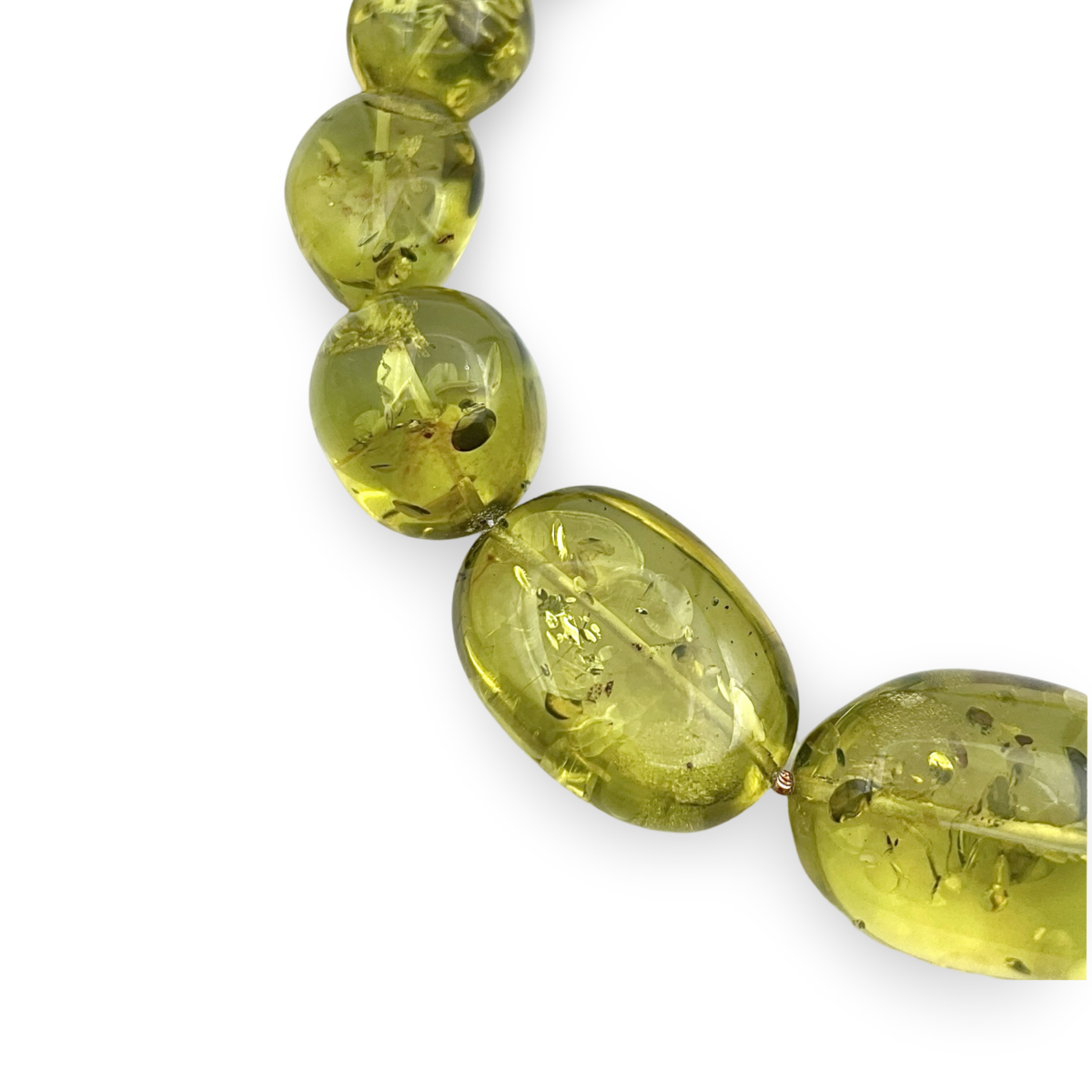 Це намисто зі зеленим бурштином з деталями з посрібленого золота 925 проби є вишуканим, розкішним аксесуаром, який поєднує природну красу зеленого бурштину та елегантність золотих акцентів. Насичені зелені бурштинові намистини, ретельно відполіровані, підкреслюють органічний шарм каменю, тоді як посріблене золото додає нотку вишуканості. Це універсальне намисто підходить як для повсякденного, так і для офіційного вбрання, що робить його ідеальним доповненням до будь-якої колекції ювелірних виробів. Воно також служить винятковим подарунком для тих, хто цінує унікальне, високоякісне ремесло.