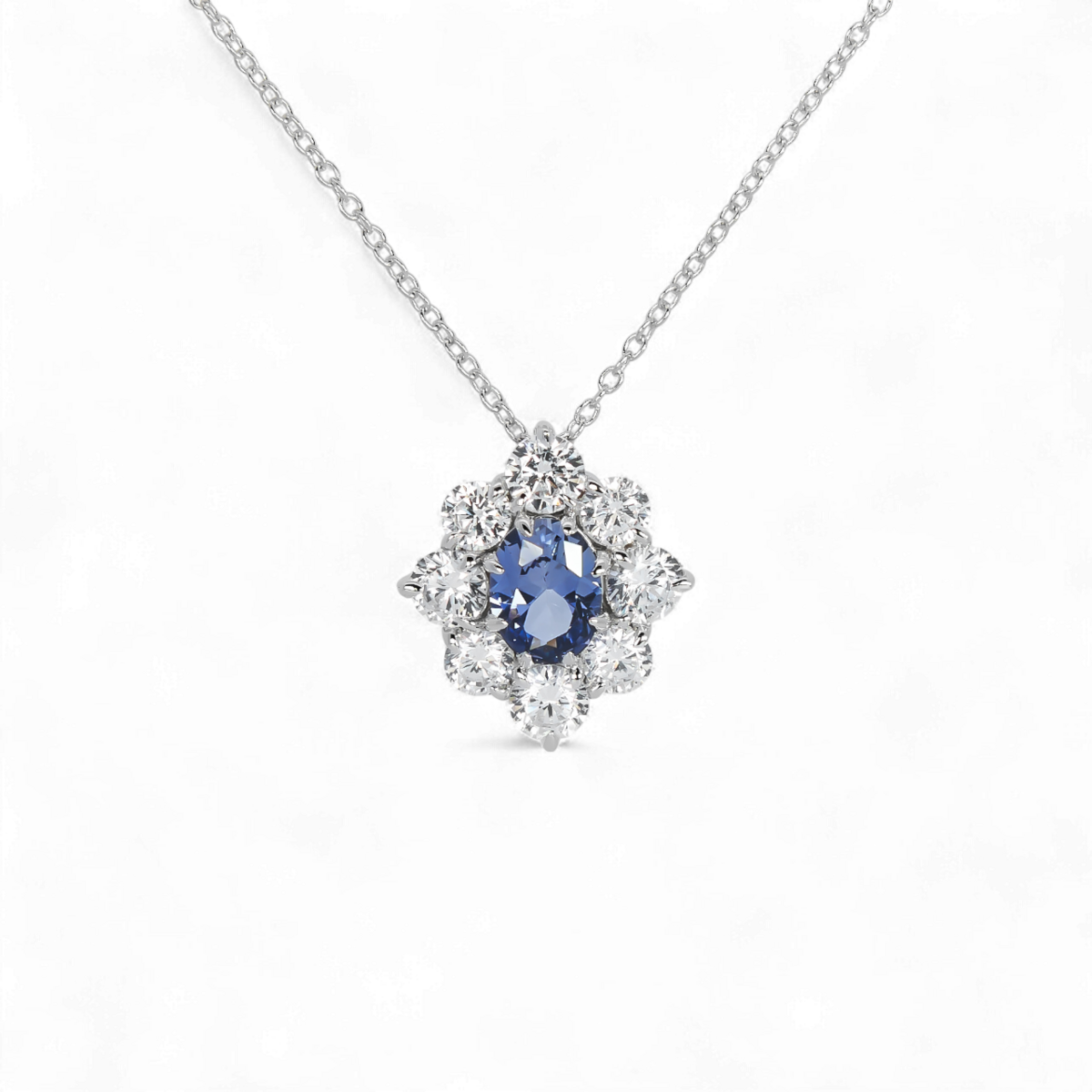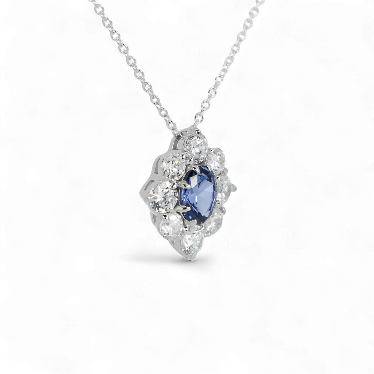 Це приголомшливе намисто з штучного сапфіру та діамантів виготовлене з високоякісного стерлінгового срібла 925, з глибоким синім цирконом у центрі, який передає багату елегантність сапфіру, красиво оточеним блискучими білими цирконами, що імітують блиск діамантів.