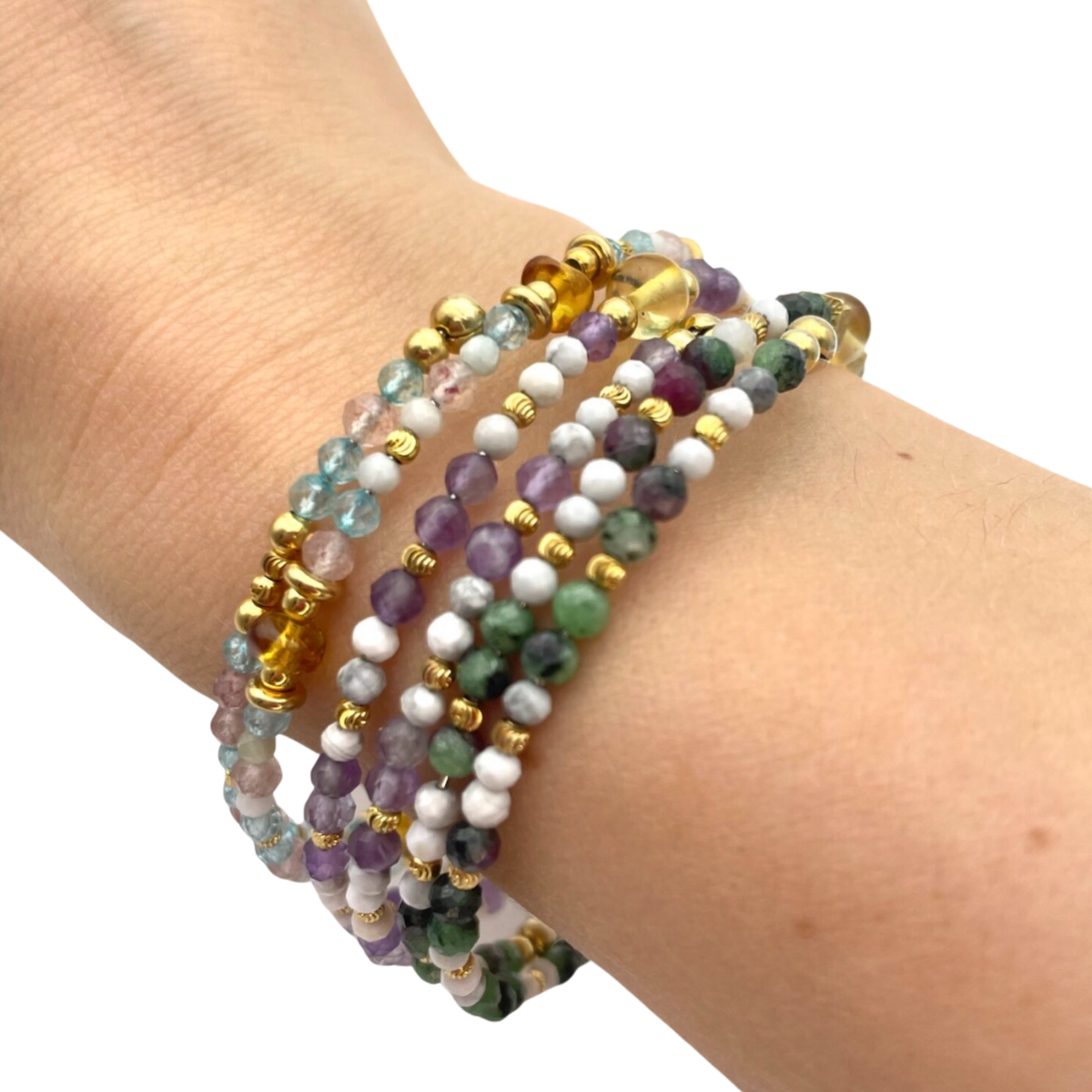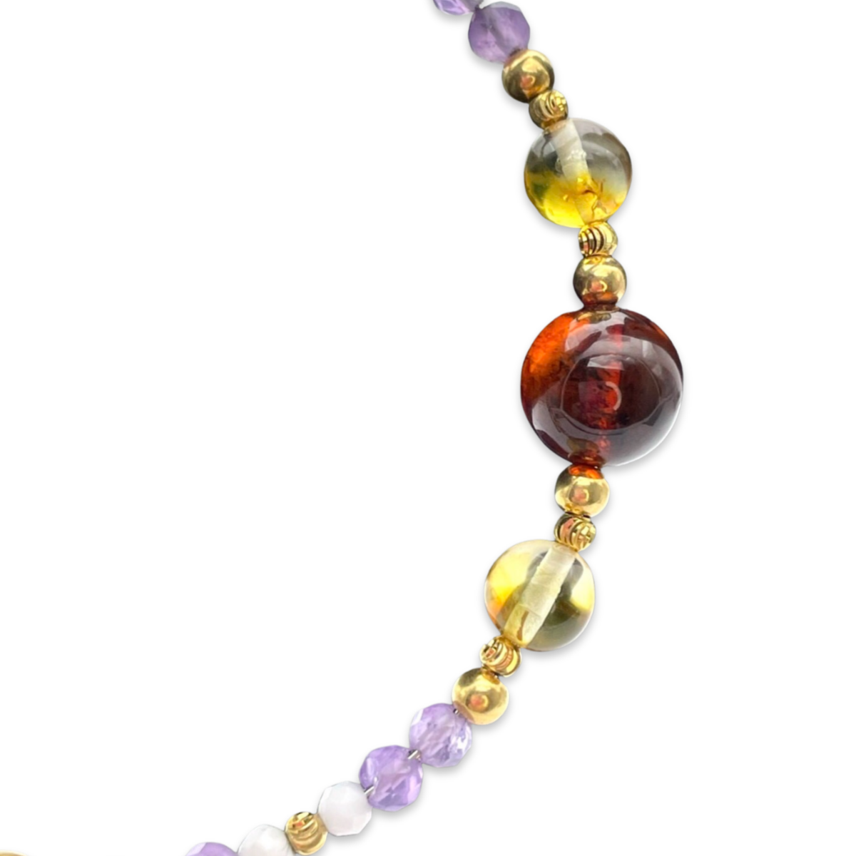 Цей приголомшливий браслет поєднує в собі гармонійне поєднання золотої позолоти та бурштинових багатокам’яних намистин. Бурштинові намистини різняться за розміром, формою та відтінками помаранчевого і коричневого, створюючи унікальний і природний вигляд. Браслет виготовлений з високоякісних матеріалів, що забезпечує довговічність і міцність. Позолота 24k додає виробу нотку елегантності та вишуканості, роблячи його ідеальним аксесуаром для будь-якої події. Браслет розроблений так, щоб комфортно сидіти на більшості розмірів зап’ястя. Незалежно від того, чи ви готуєтесь до офіційного заходу, чи додаєте яскравості своєму повсякденному образу, цей браслет з позолотою та бурштиновими багатокам’яними намистинами неодмінно справить враження.