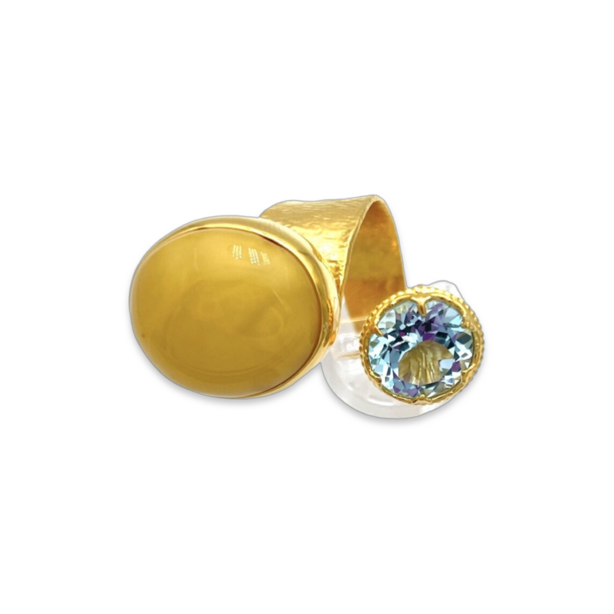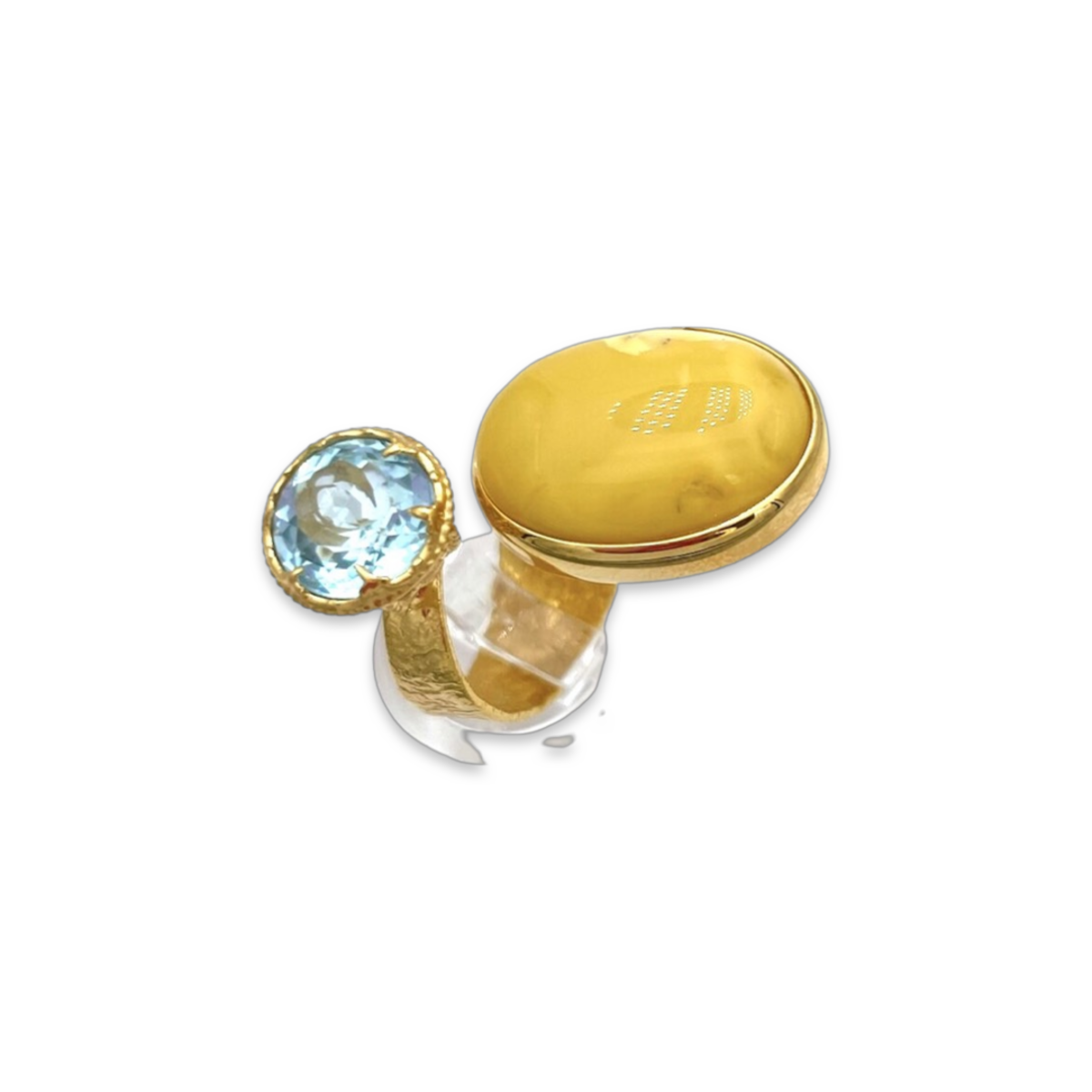 Цей вишуканий перстень виготовлений із срібла з позолотою та прикрашений двома приголомшливими дорогоцінними каменями - бурштином і топазом. Теплі, насичені відтінки бурштинового каменю ідеально доповнюються блискучою яскравістю топазу, створюючи заворожуючий контраст, який неодмінно приверне увагу.