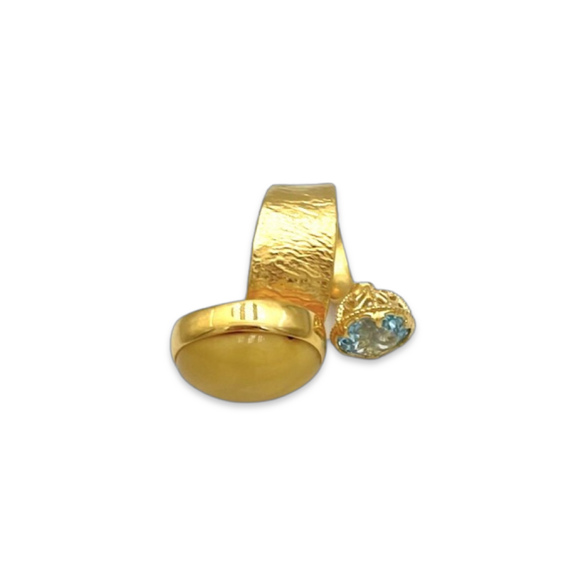 Цей приголомшливий кільце з позолотою має прекрасне поєднання бурштину та топазу. Теплий, золотистий відтінок бурштину доповнює блискучий синій топаз, створюючи захоплюючий та унікальний ювелірний виріб.