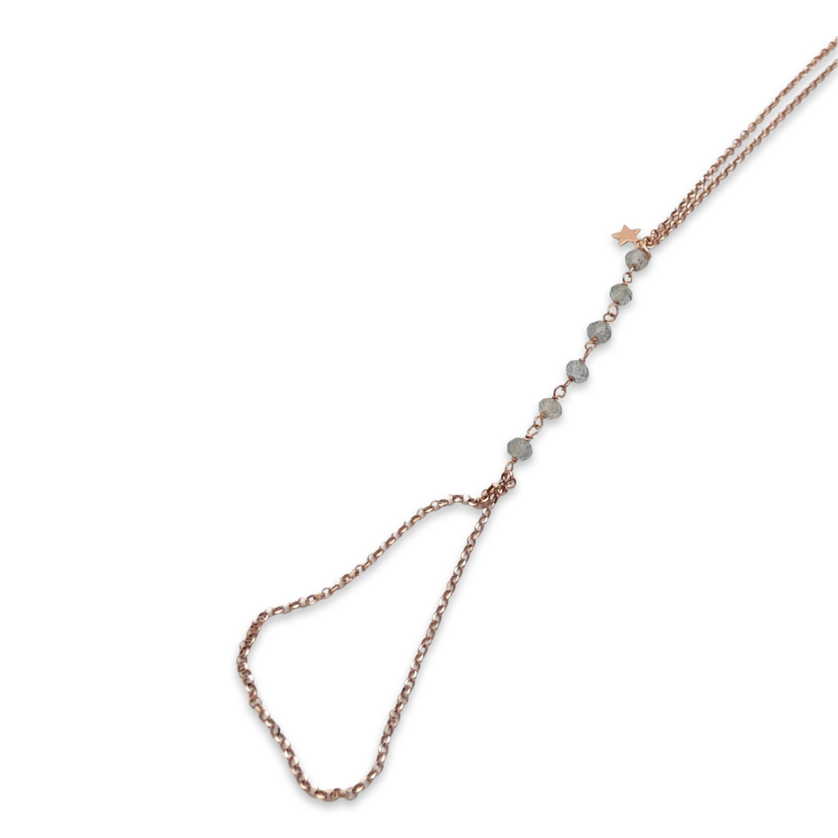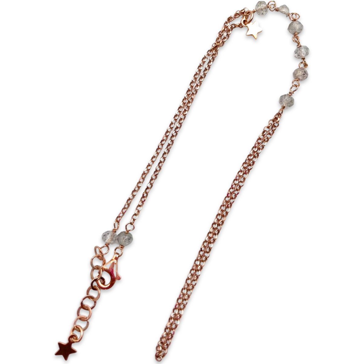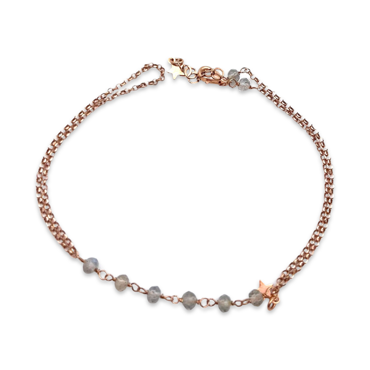 This Labradorite chain bracelet features a series of small, polished Labradorite stones linked together by delicate silver chains. The stones exhibit a unique iridescence, displaying shades of grey in the light. The bracelet is adjustable in length and fastens securely with a lobster clasp. The understated design makes it a versatile piece that can be worn alone or layered with other bracelets. This high-quality bracelet is handmade with care to ensure its durability and beauty.