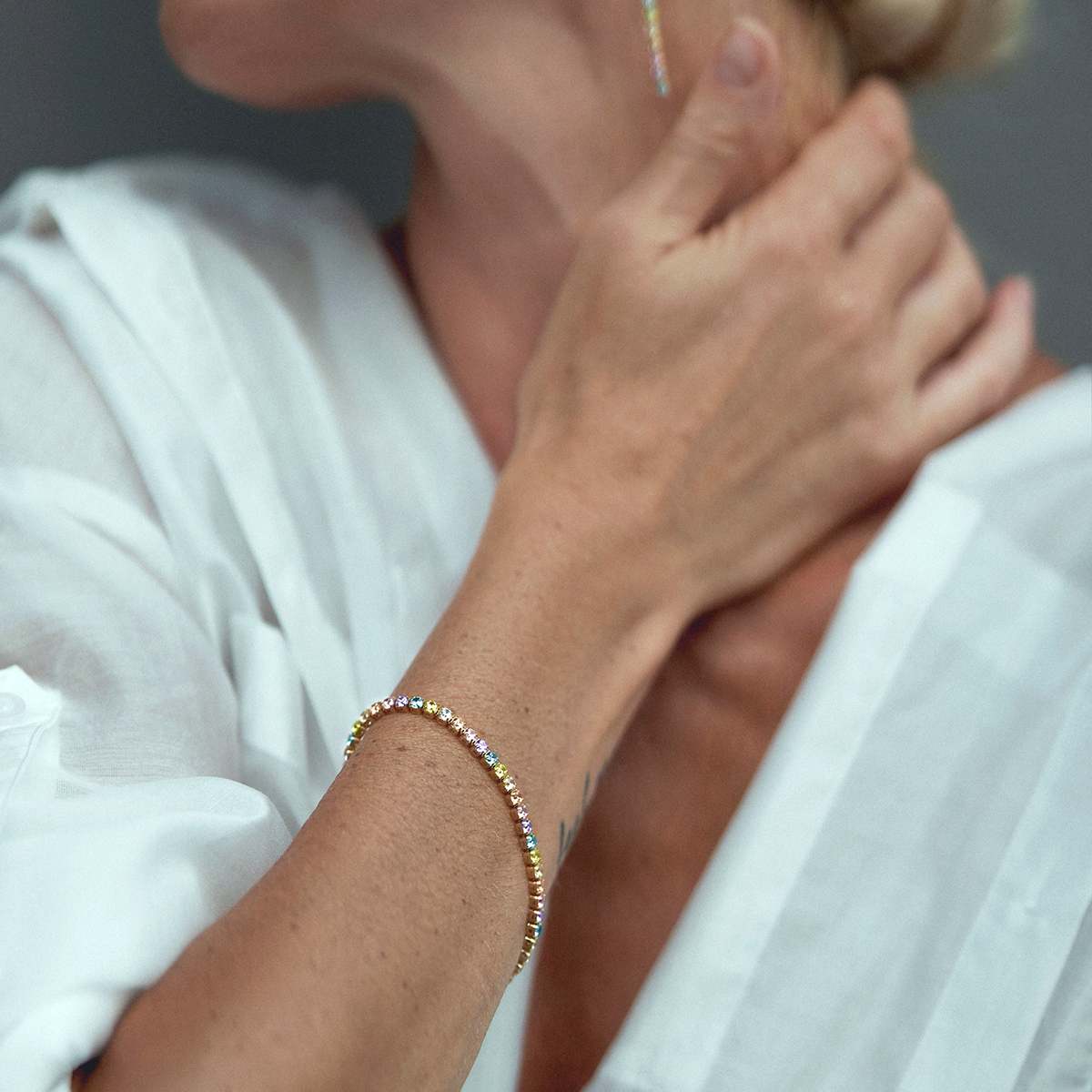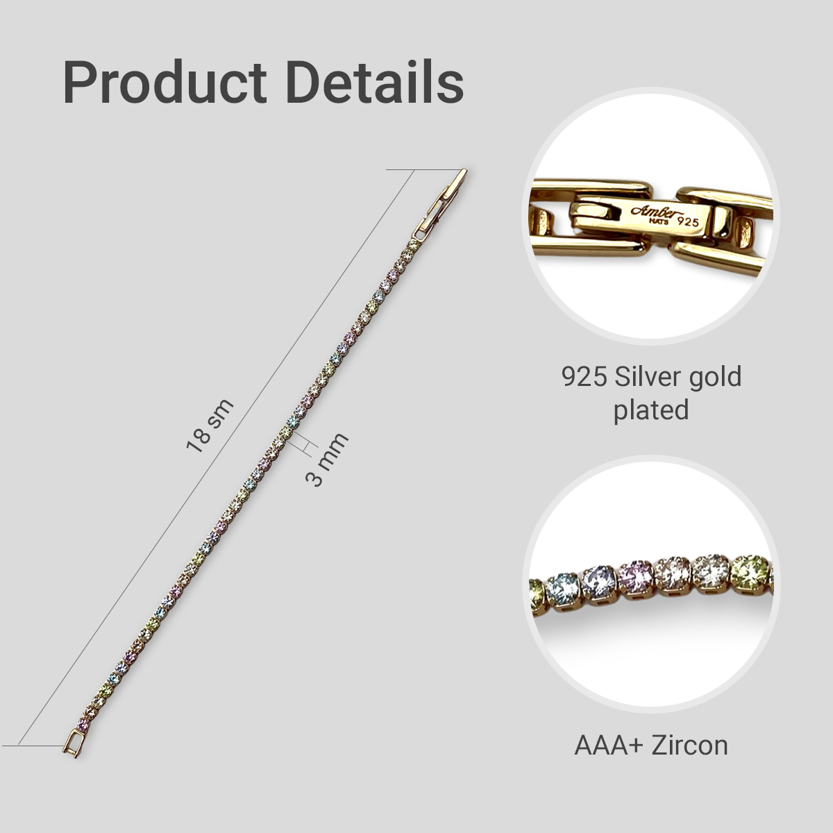 Виготовлений із високоякісного стерлінгового срібла 925 проби та делікатно покритий сяючим золотом, цей тенісний браслет має приголомшливий набір багатобарвних цирконів. Кожен циркон ретельно встановлений, створюючи безперервну лінію блиску, що привертає увагу з кожним рухом.