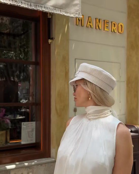Цей образ передає суть стриманої елегантності через підбір класичних речей у світлих білих тонах.